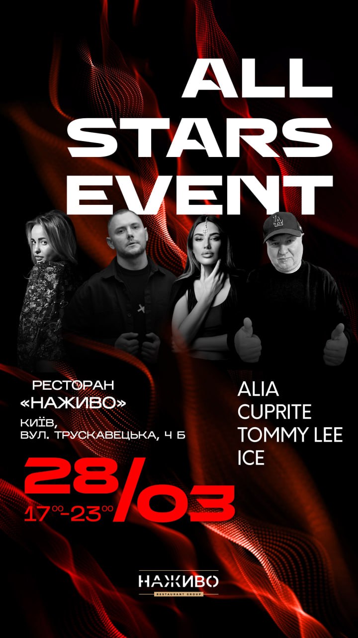 ALL STARS EVENT — це серія вечірок для людей, які досягли певних висот, але й не втратили смаку до простого життя. Це вечір без випадкових облич. Тільки перевірений часом line-up, затишна атмосфера ресторану «Наживо» та оточення, з яким приємно розділити спільні інтереси і будувати майбутнє.