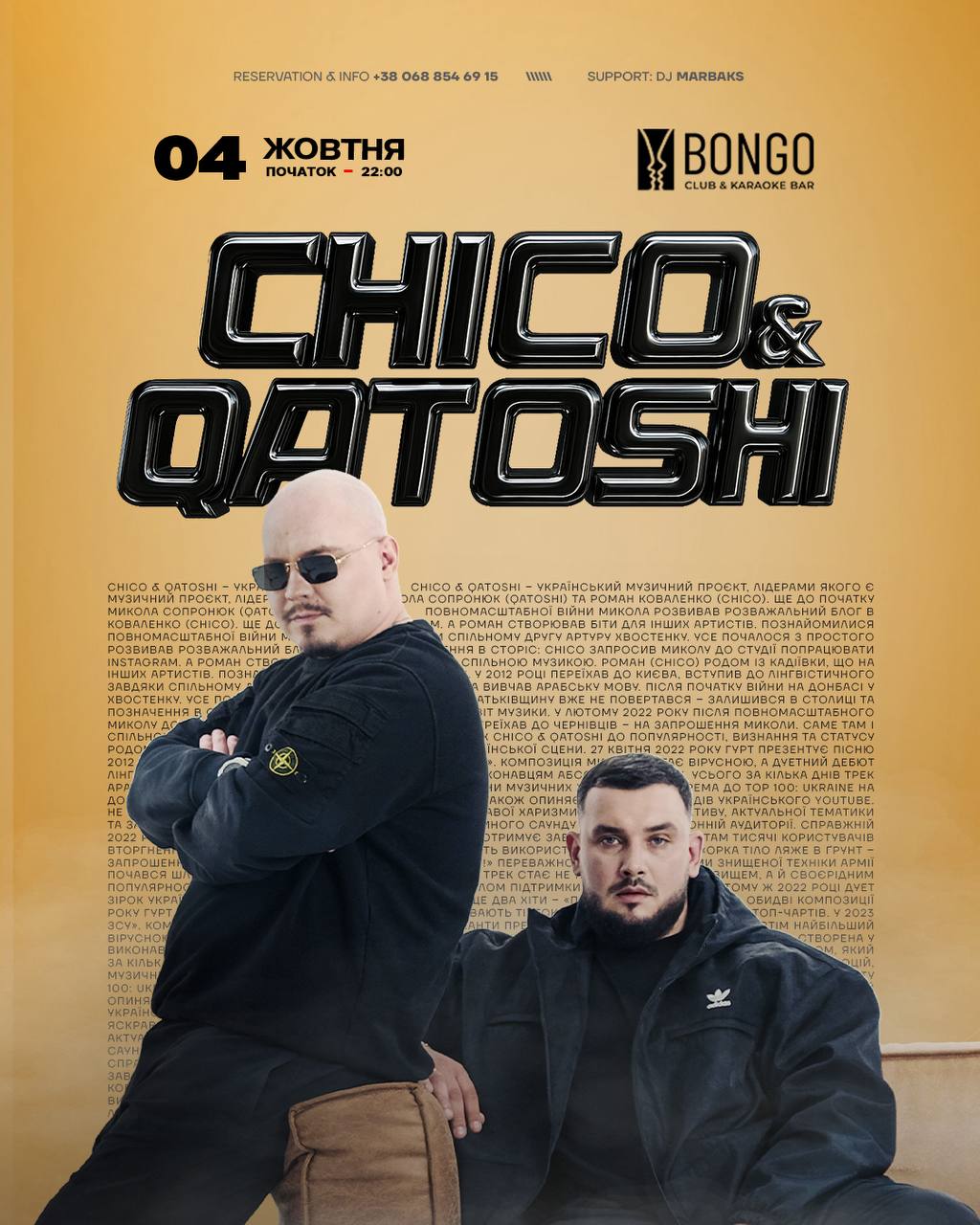 Зустрічайте — ЧІКО & КАТОШІ у клубі BONGO! ВАШІ УЛЮБЛЕНІ ТРЕКИ «ПОКОХАЙ МЕНЕ», «АКАЦІЯ», «ТАЙНОЮ» та інші залунають на сцені BONGO club.
