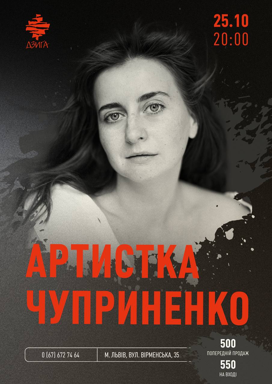 25 жовтня запрошуємо вас на сольний концерт Артистки Чуприненко у Львові. Це буде вечір про дієслова у мові любові, про танці тендітних почуттів, про ковзання пальців по шкірі коханої людини.