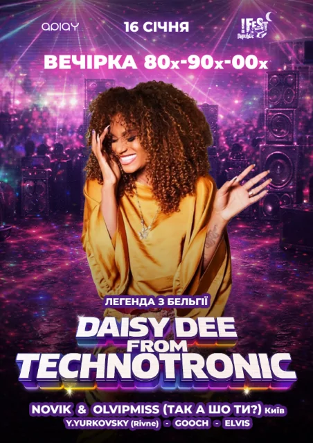 16 січня ми зберемося всі разом у «FESTrepublic», щоб поринути в спогади та атмосферу тих часів і відірватися на повну. Окрім зірки DAISY DEE з TECHNOTRONIC, на вас чекатимуть не менш легендарні українські виконавці, які точно знають, як передати вайб того часу в своїх сетах, а саме: