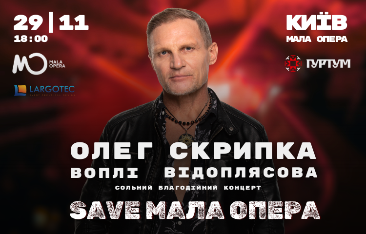 Легендарний ОЛЕГ СКРИПКА та гурт «ВОПЛІ ВІДОПЛЯСОВА» 29 листопада 2024р. зіграють ексклюзивний сольний концерт у Києві та стануть хедлайнерами благодійного проєкту «SAVE МАЛА ОПЕРА»!