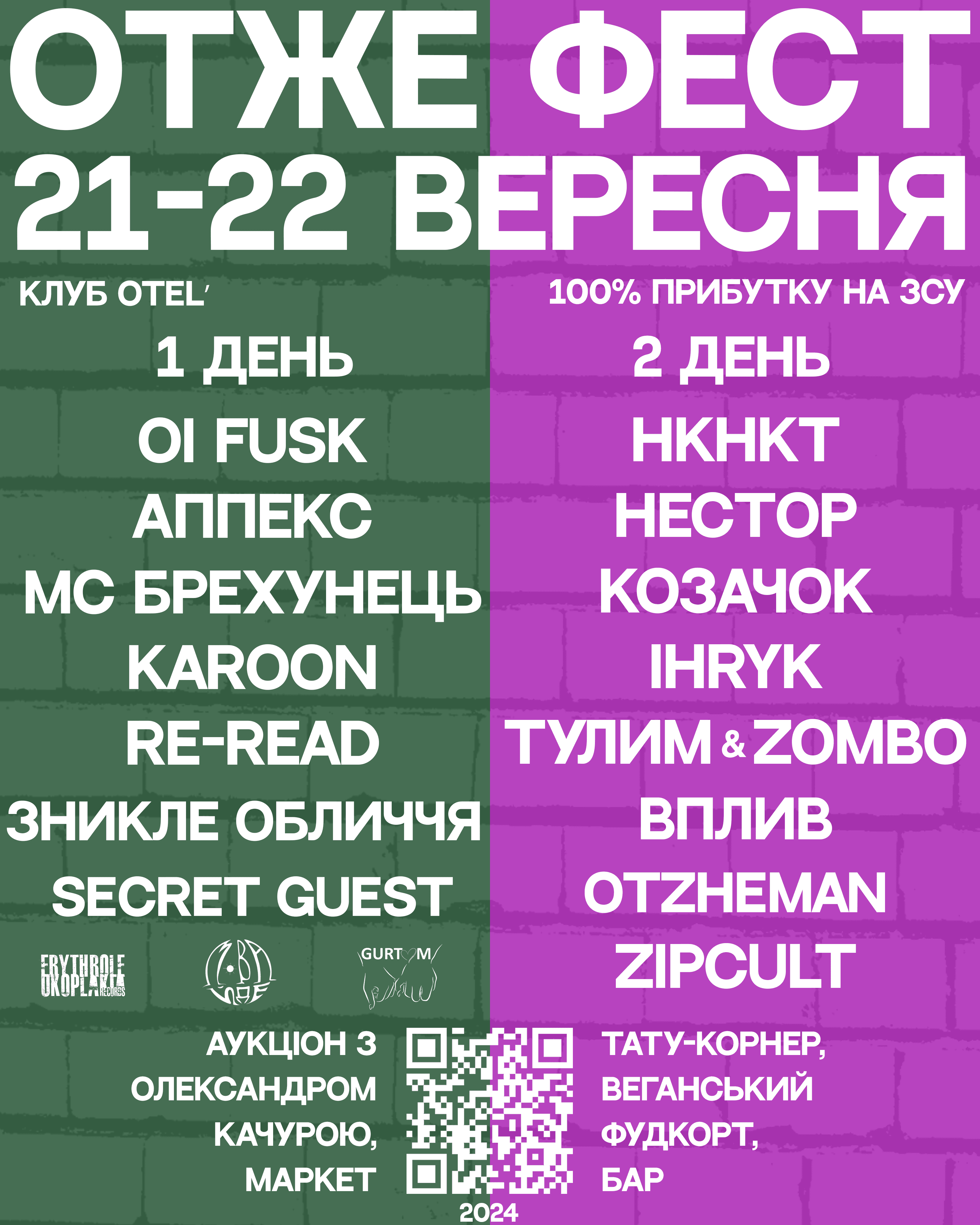 — 22-09-2024ОТЖЕ ФЕСТ повертається, цьогоріч він пройде в клубі OTEL' 21-22 ВЕРЕСНЯ, і як завжди, головна ціль це допомога ЗСУ, тому весь прибуток відправиться на збір фонду Гуртом UA !
