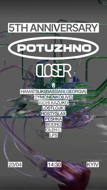 Причин нарешті зустрітись ми маємо значно більше, ніж одну: по-перше, святкуємо п'ятиріччя промо-групи POTUZHNO; по-друге, вітаємо з днем народження аж трьох артистів з нашого лайнапу. Засновник POTUZHNO — Rostyslax, резидент POLYGON— Bodro, і Kichi Kazuko з формації DRIFTKYIV що прямуватиме до нас з Порту — всі святкують новий рік життя в один день та прийматимуть вітання на танцполі.