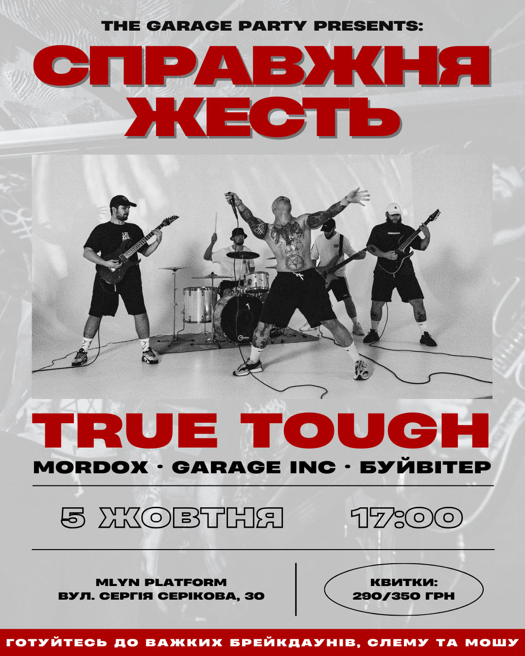 🗓 05.10.2024, відкриваємо двері о 16:00; 📍 Креативна платформа "Млин", вулиця Сергія Серікова, 30; 🎫 від 290 грн. Замовити можна за посиланням https://ottry.com/events/the-garage-party-true-tough
