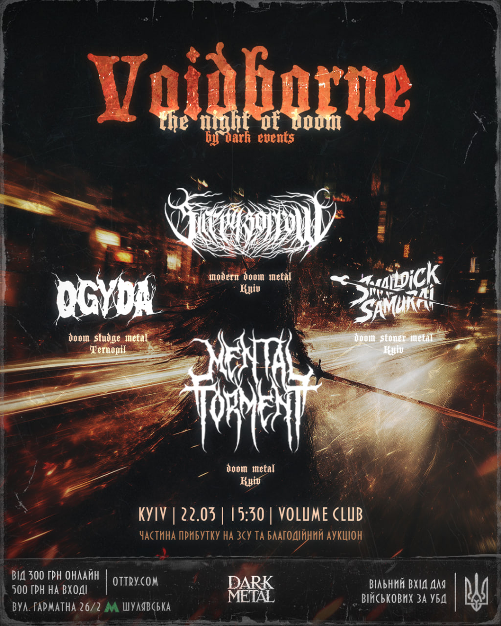 22 березня київські лицарі думу — Sleepy Sorrow та Mental Torment — повертаються, щоб знову занурити вас у незабутню атмосферу. Разом із тернопільськими сладжерами Ogyda та колегами зі столиці Smalld$ck Samurai вони влаштують справжній вечір думу.